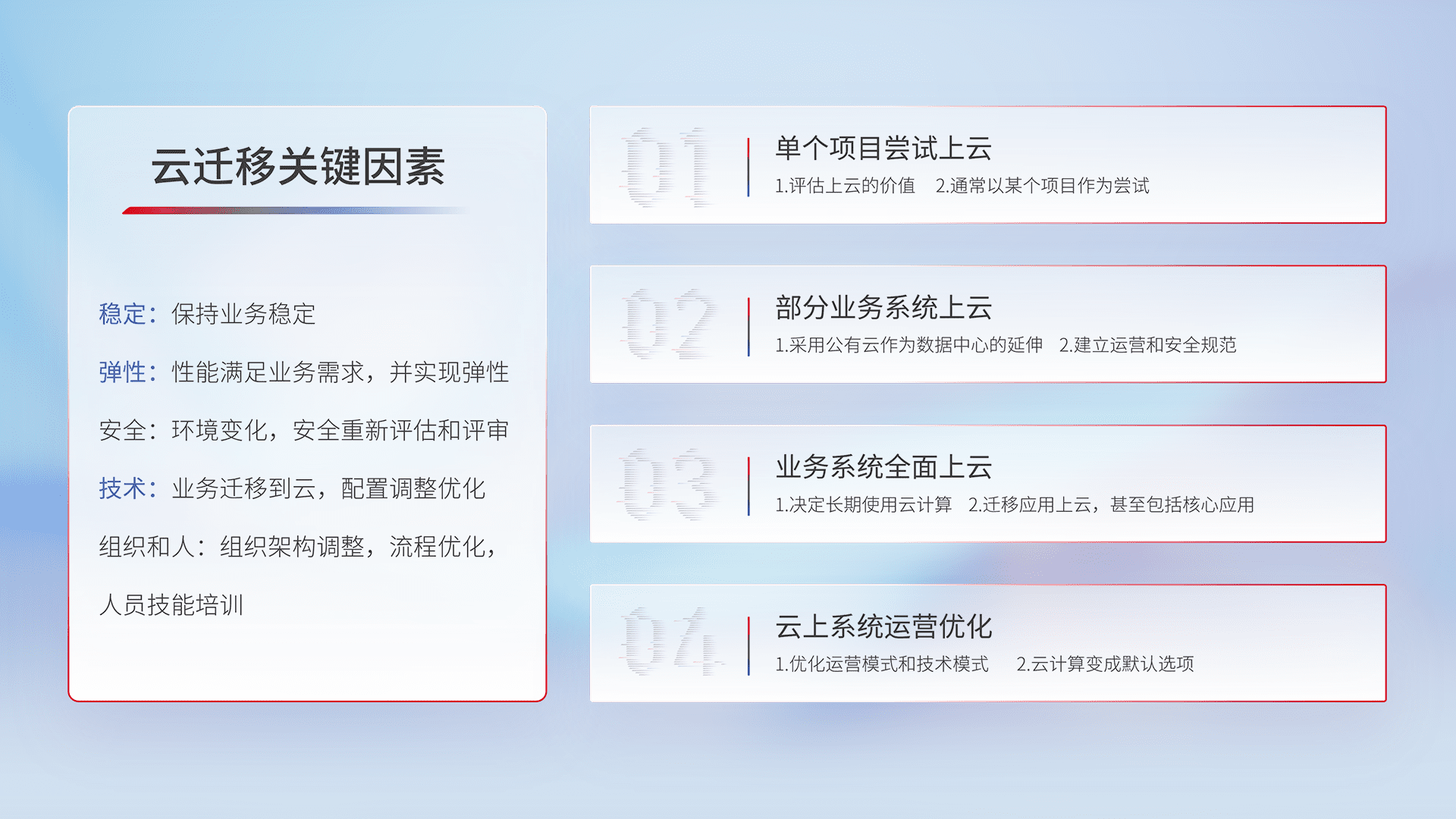 结合实际业务,,,,从规划设计、、云平台选型、、云原生改造、、数据迁移、、、集成交付,,迁移全过程为客户识别最佳上云路径,,,,做好风险识别管理,,,设计网络架构、、、、身份权限、、、安全审计合规、、操作审计、、日志审计、、监控告警策略、、多站点容灾设计等,,,,对云上基础设施进行整体规划,,,提升IT治理水平,,,以满足弹性、、、高可用、、高性能的需求。。。。